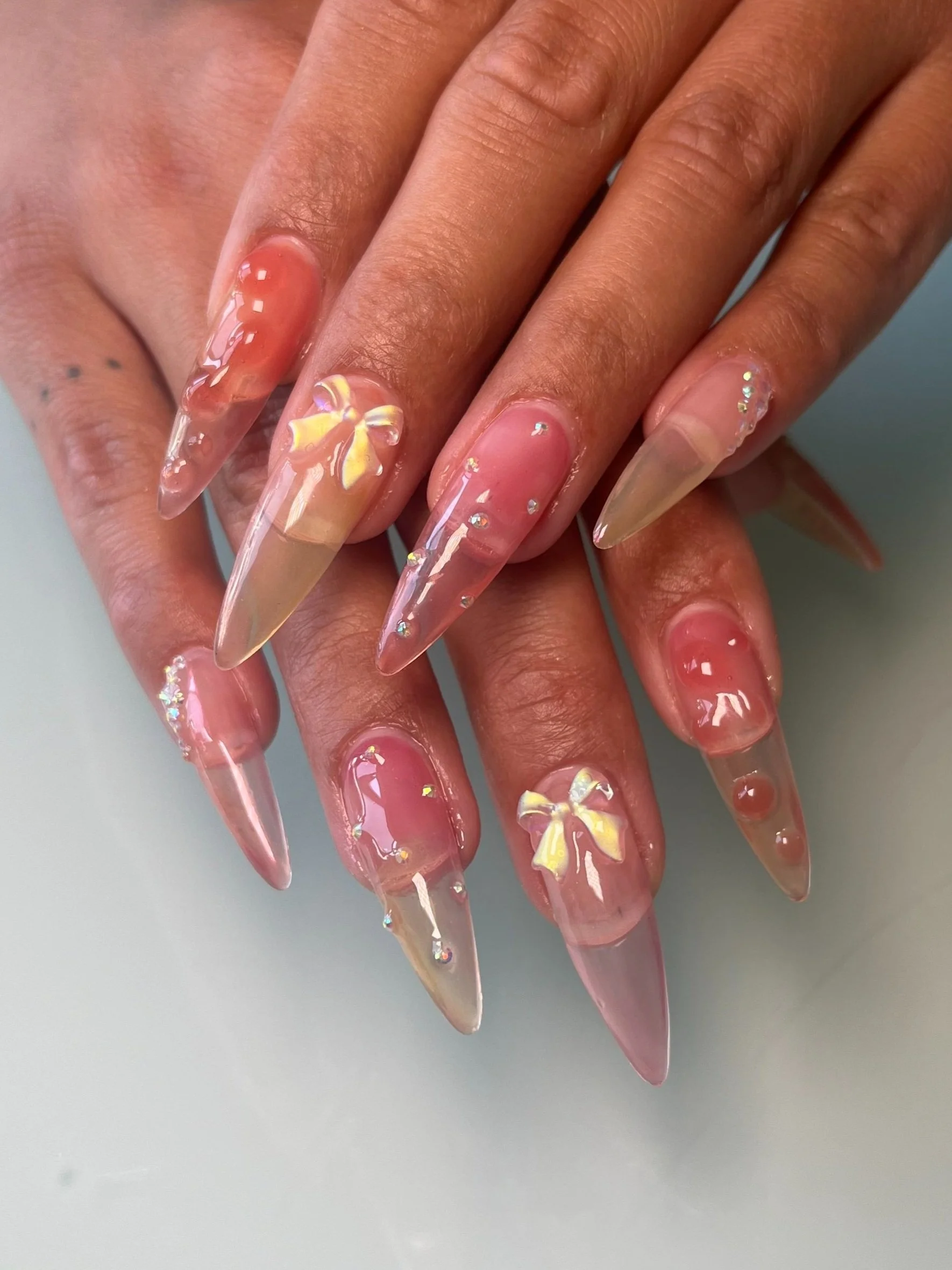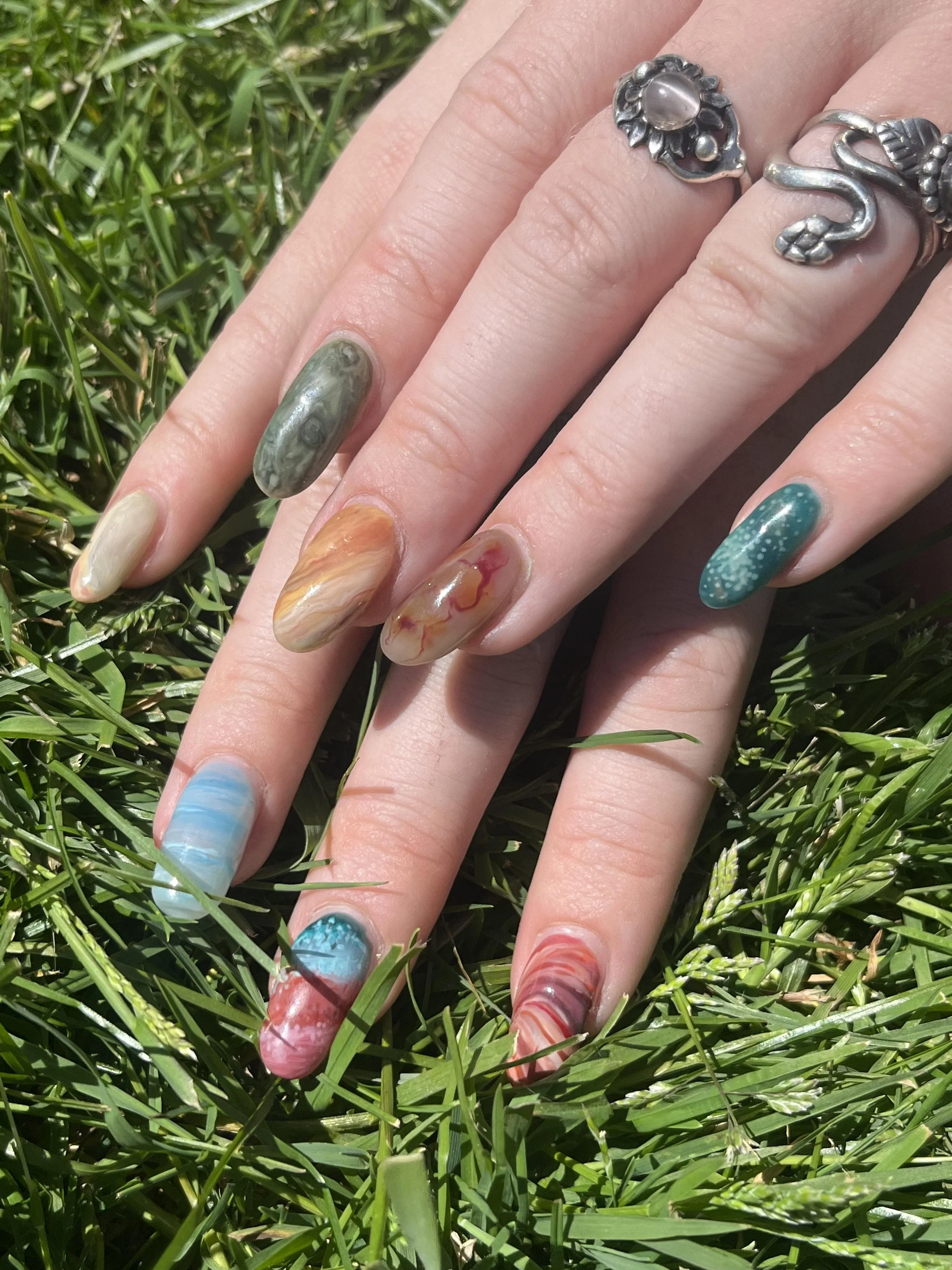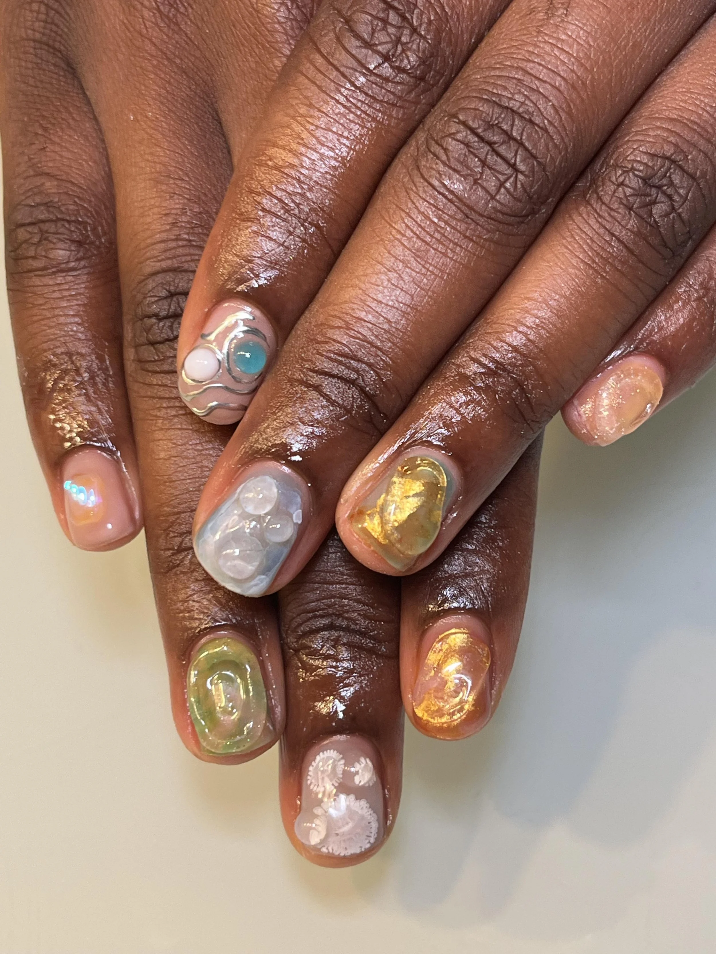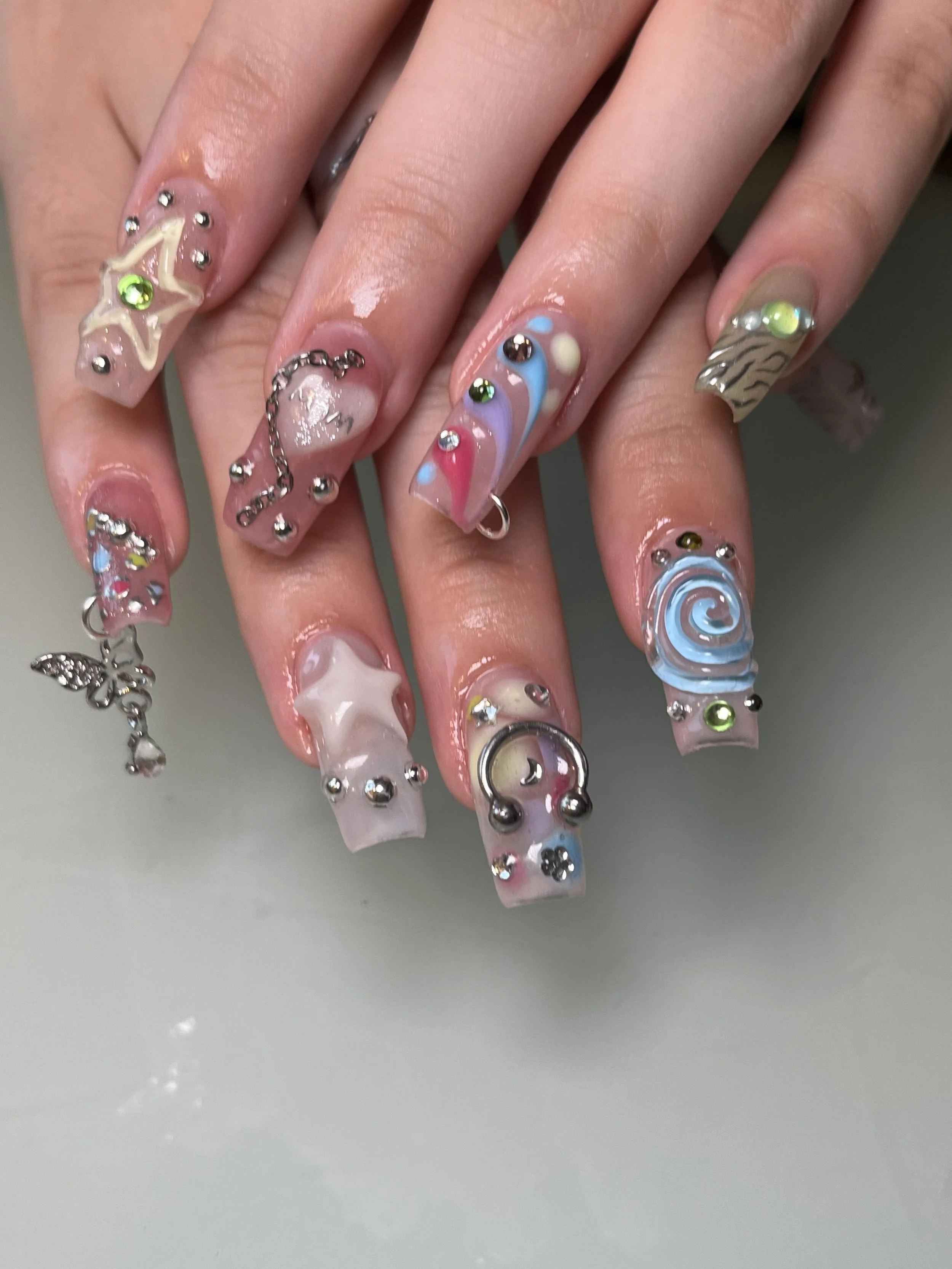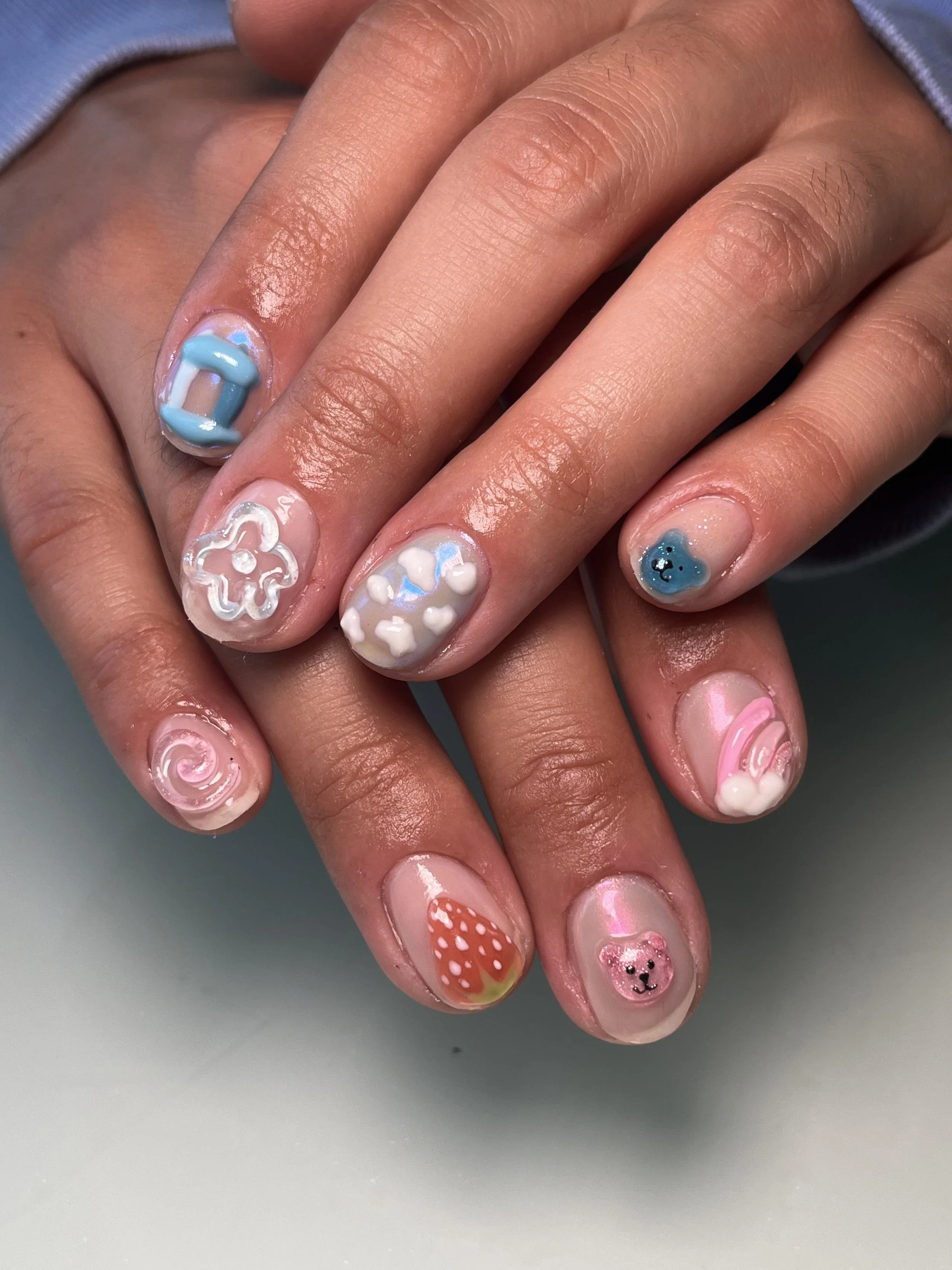 dry manicure, simple color designs, and/or minimal 3d gel/ charms