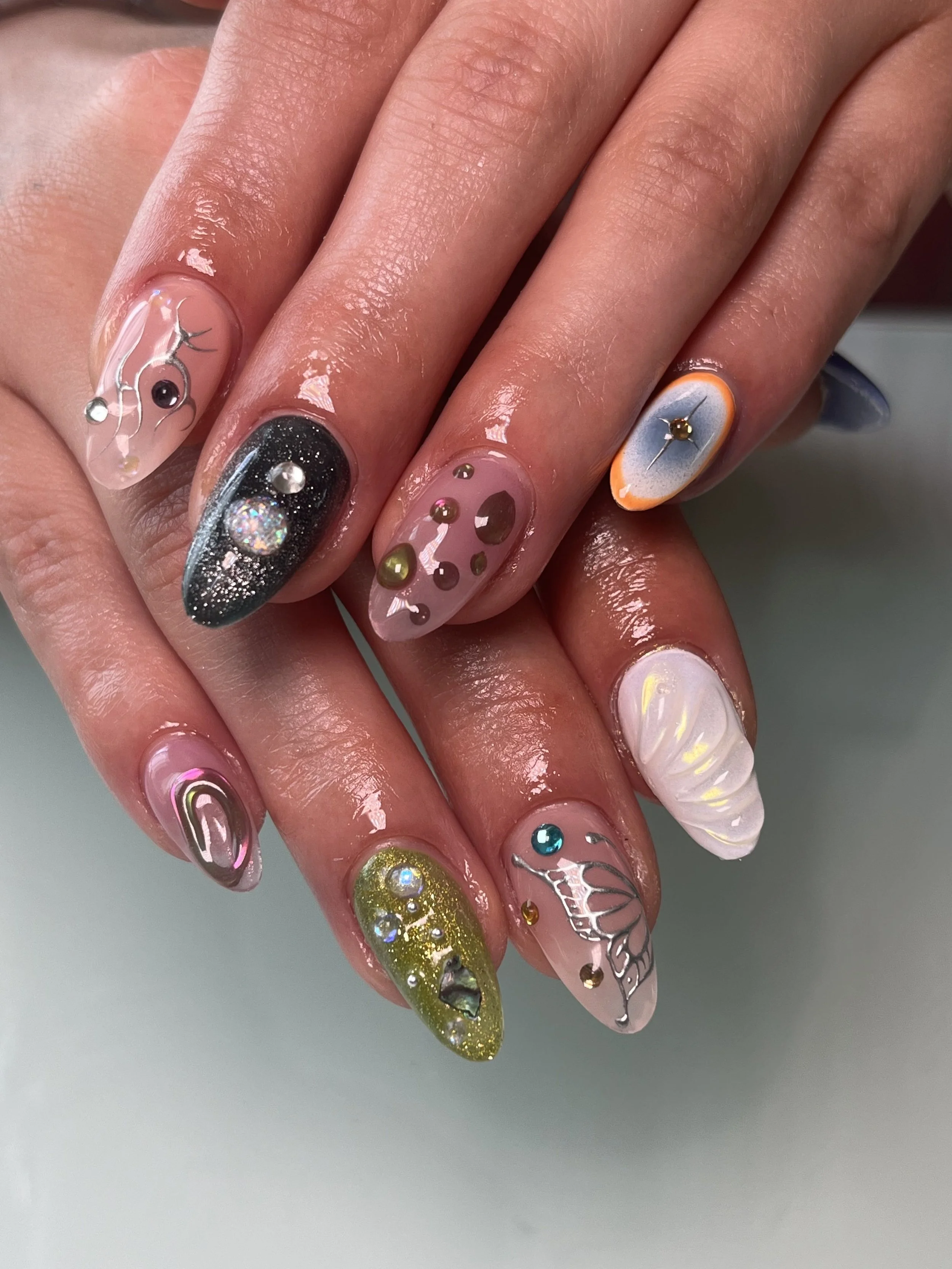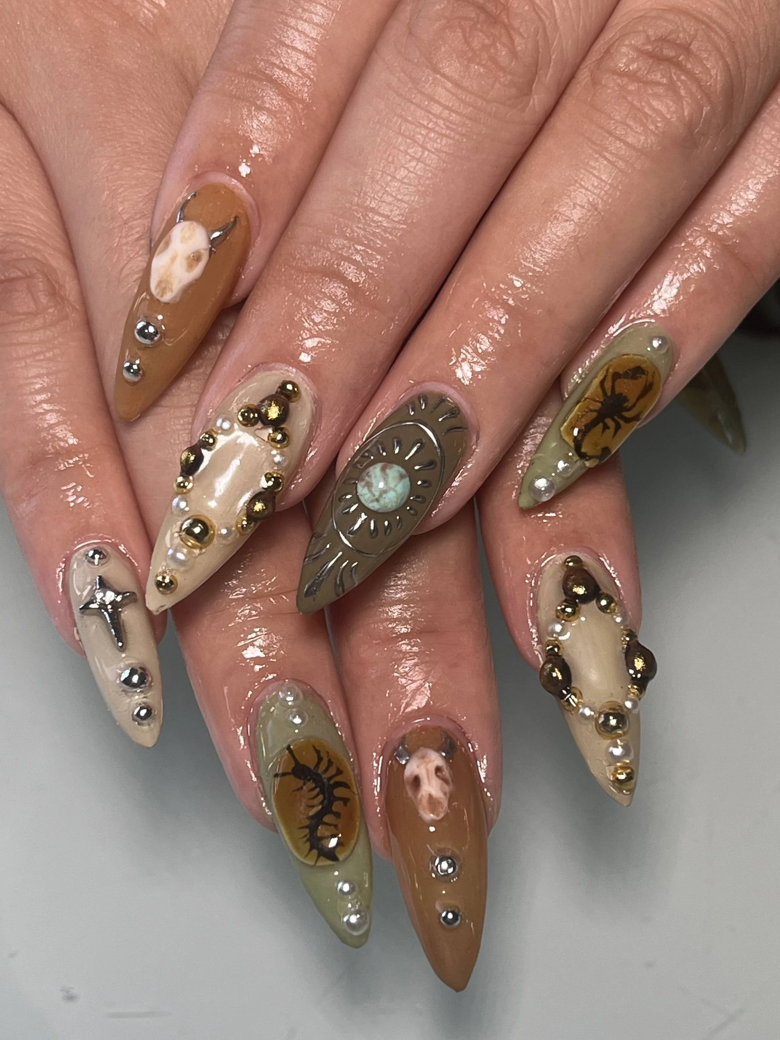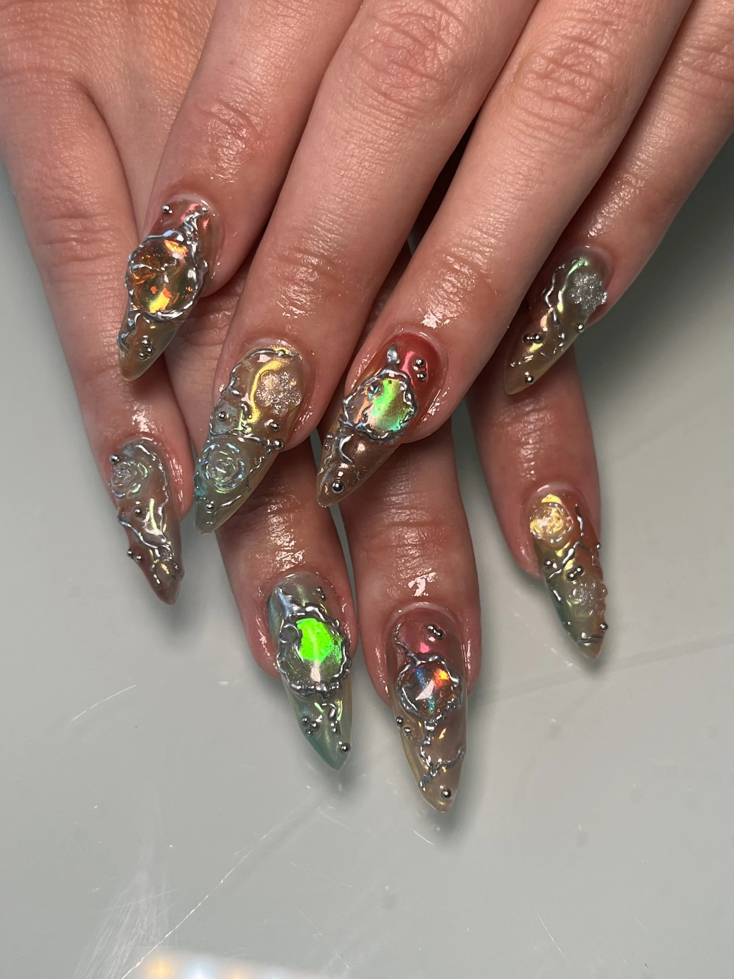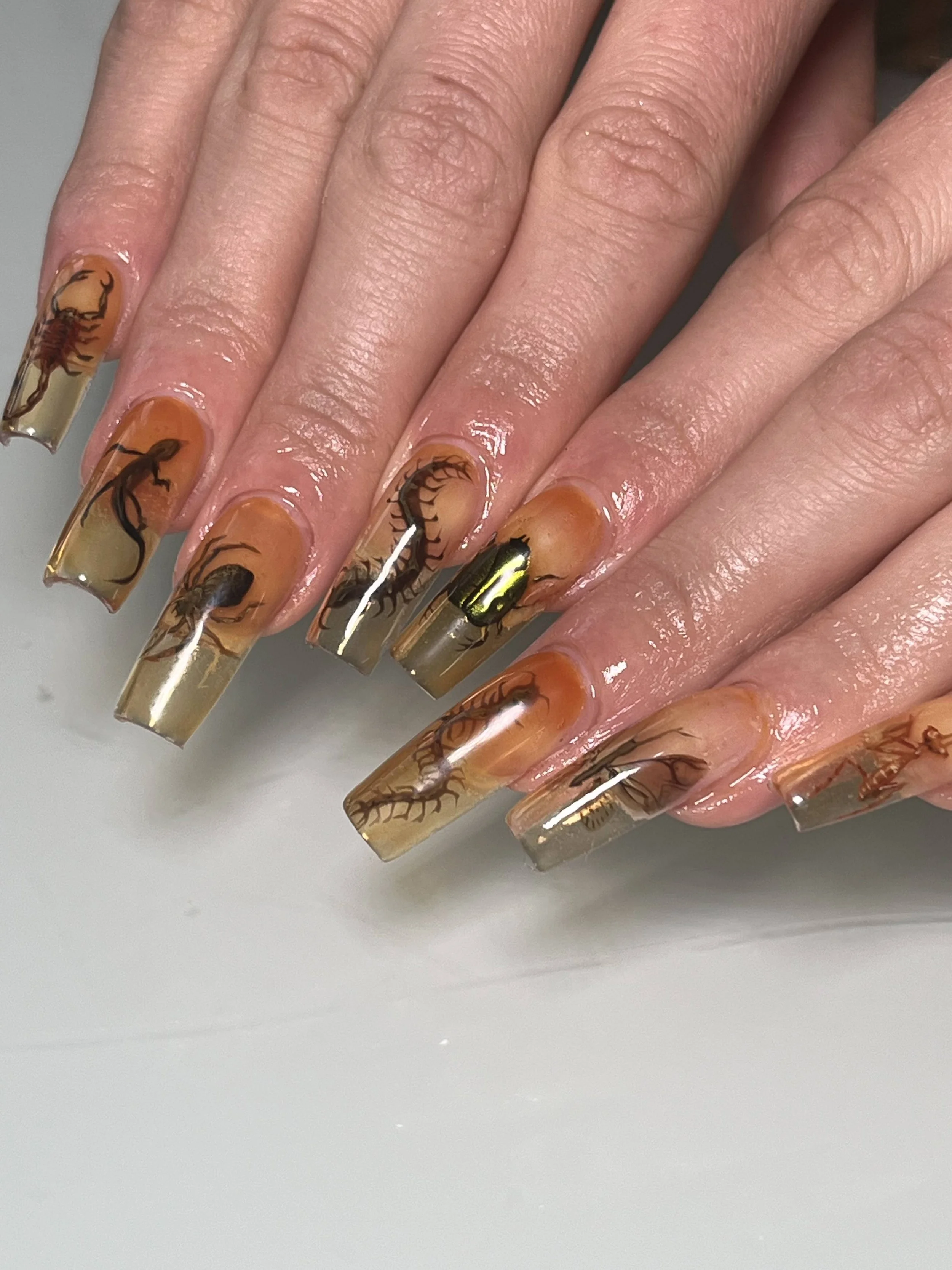 dry manicure, simple color designs, and/or minimal 3d gel/ charms